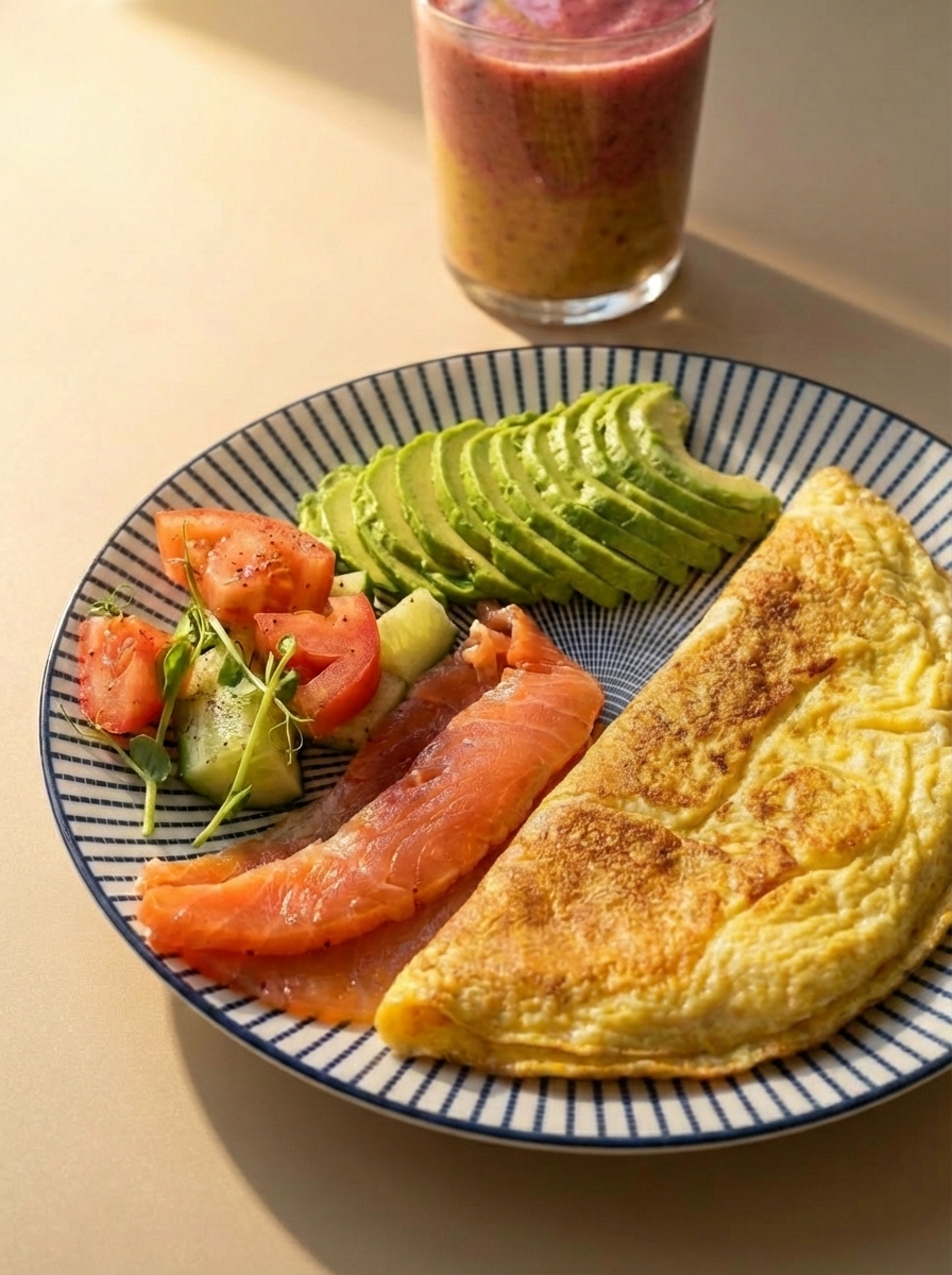 Большой завтрак с омлетом, лососем и авокадо