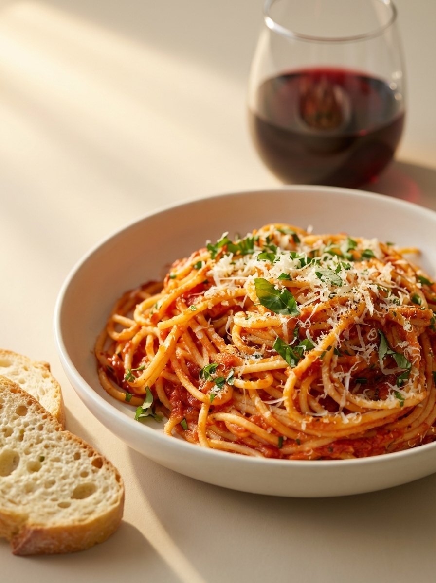 Спагетти с томатным соусом и пармезаном