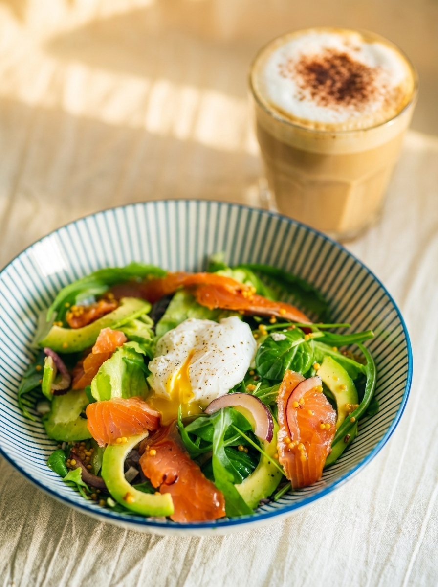 Салат с форелью, авокадо и яйцом пашот