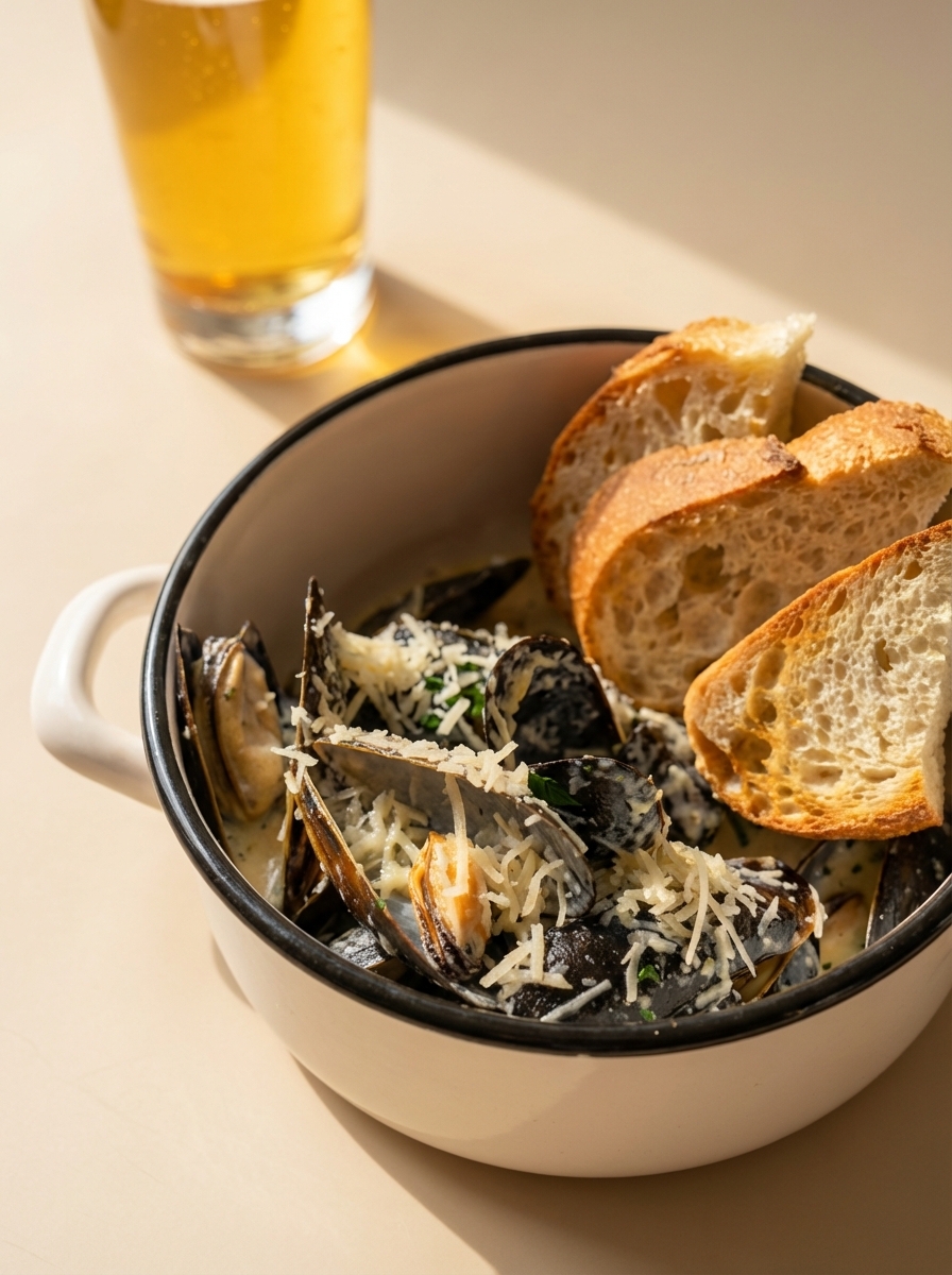 Мидии на белом вине с сыром Пармезан, тостами
