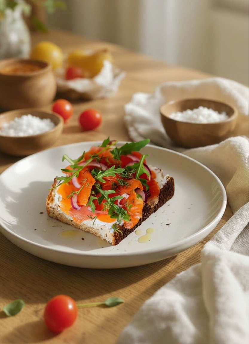 Хлеб ремесленый, форель, творожный сыр, красный лук, укроп, руккола