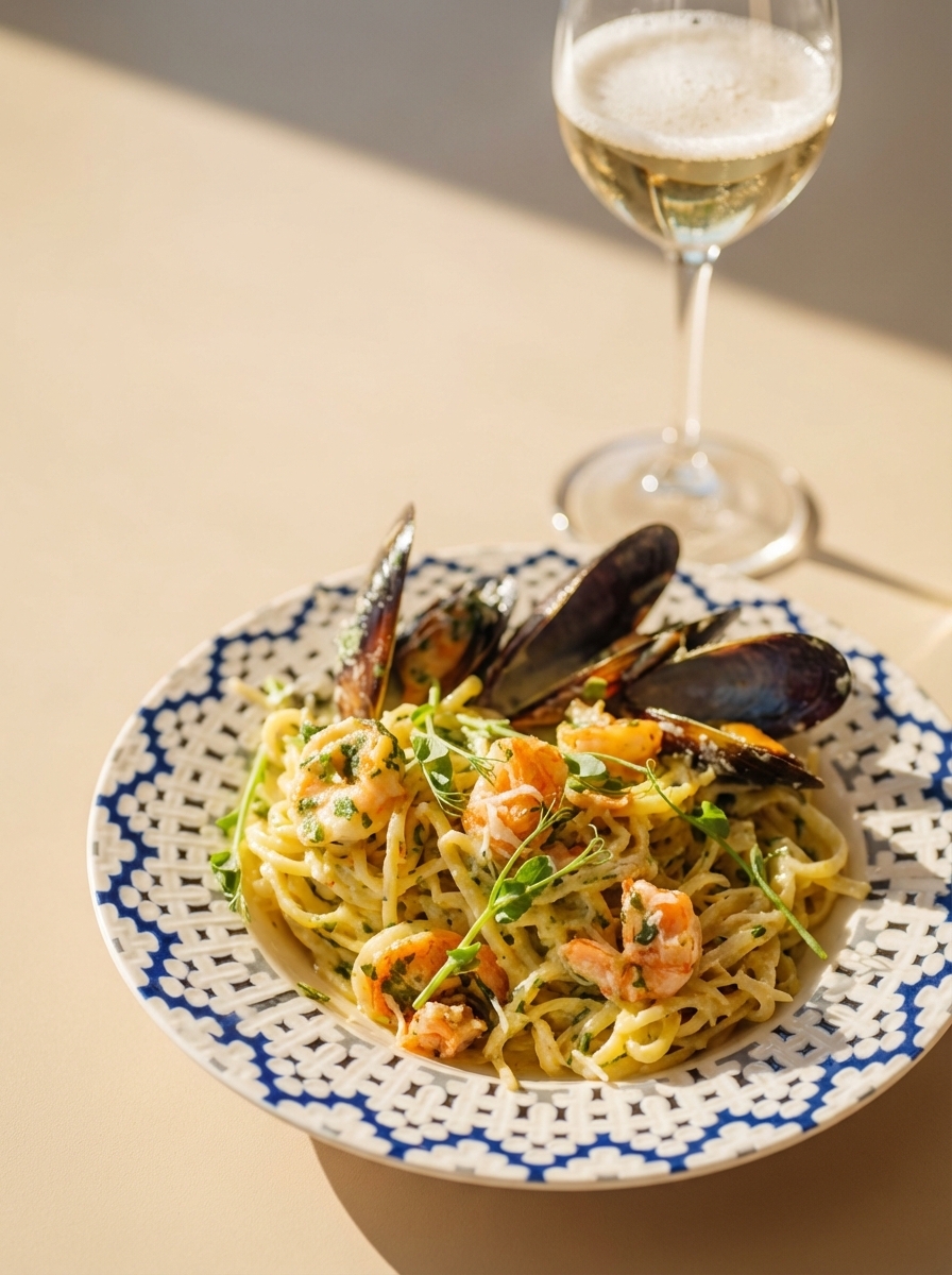 Паста, тигровые креветки тигровые ,мидии, форель, шпинат, сливки, пармезан, вино