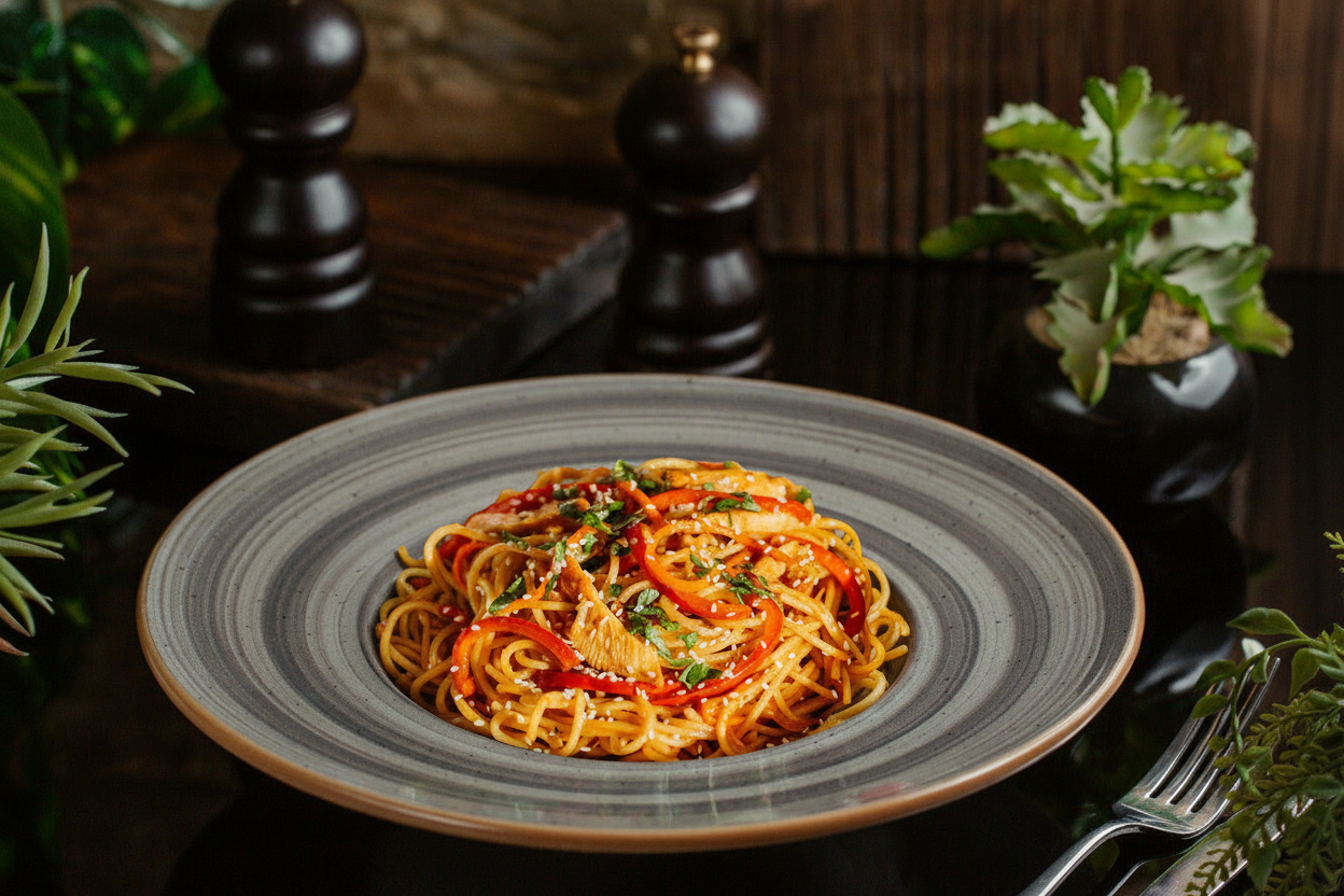 Спагетти, филе куриное, паприка, лук, морковь, паста том-ям, сироп топинамбура, чеснок, кунжут, кинза, соевый соус, масло подсолнечное 250гр