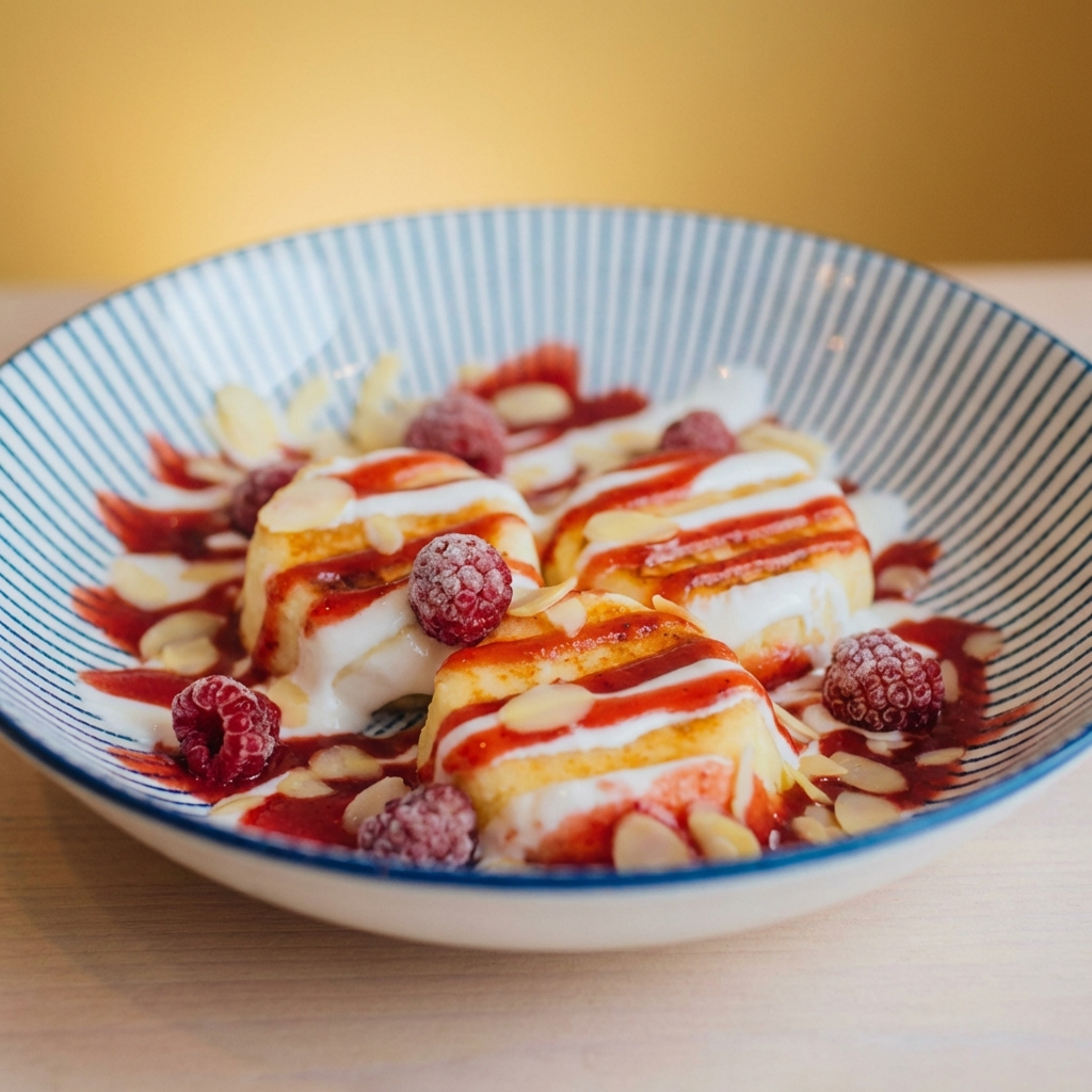 Творог, рисовая мука, сироп топинамбура, топленое масло, ягоды, клубничный соус, миндальные лепестки