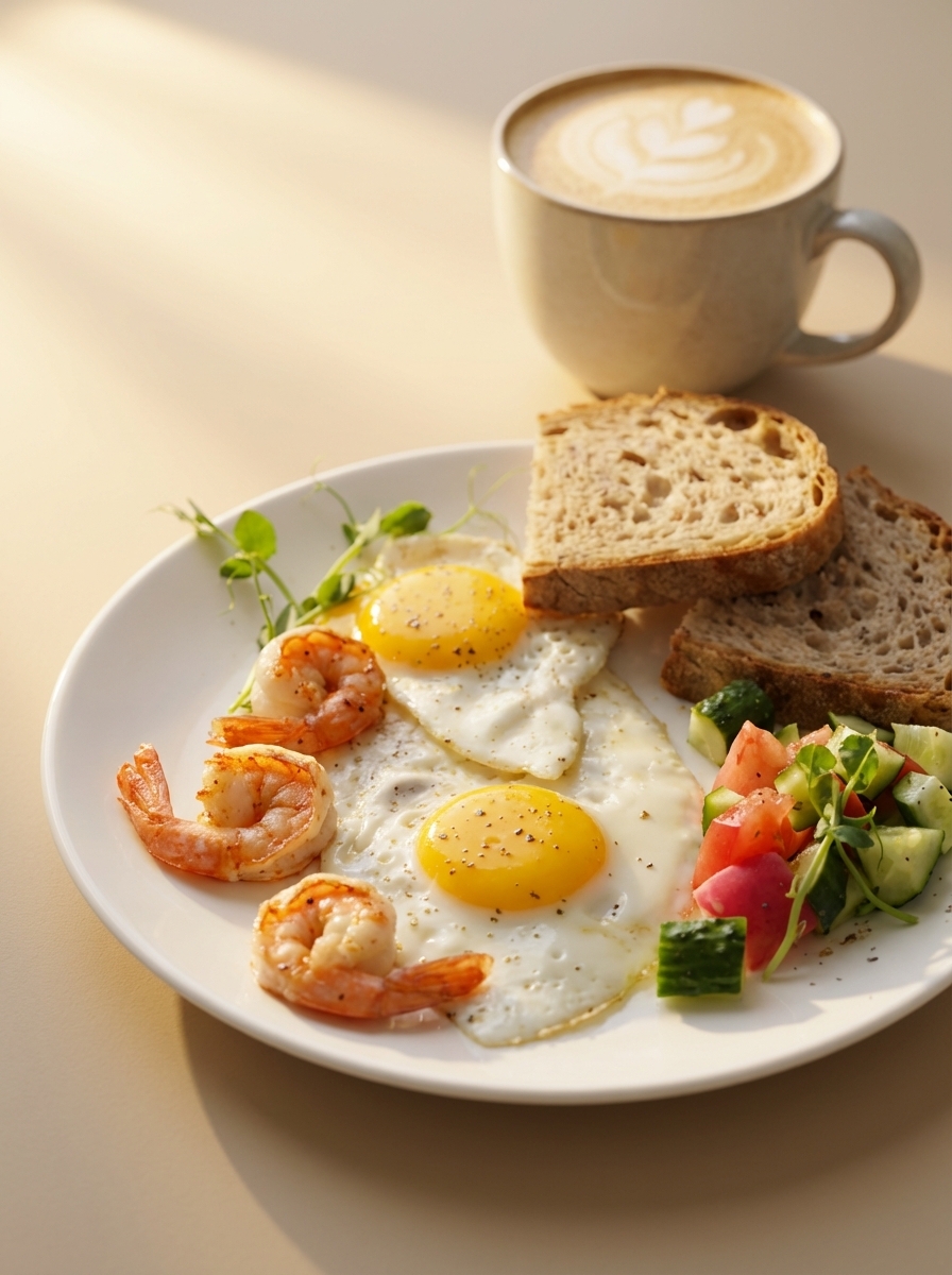 Глазунья с тигровыми креветками и чесночным маслом