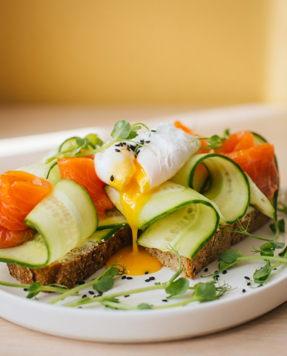 Ржаной хлеб, слабосоленая форель, огурец, творожный сыр, микрозелень