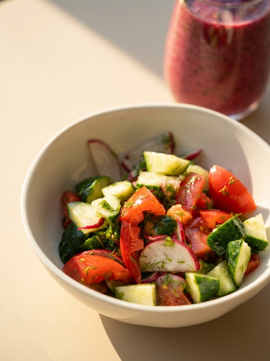 Помидор, огурец, красный лук, редис, зелень, масло растительное / сметана (на выбор) 280гр