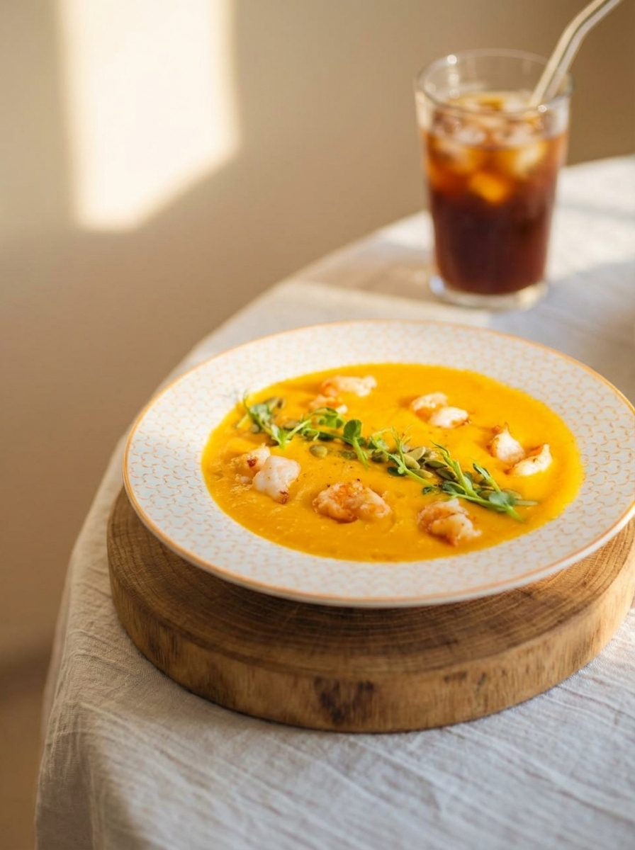 Тыквенный суп-пюре с чесночными гренками / креветками