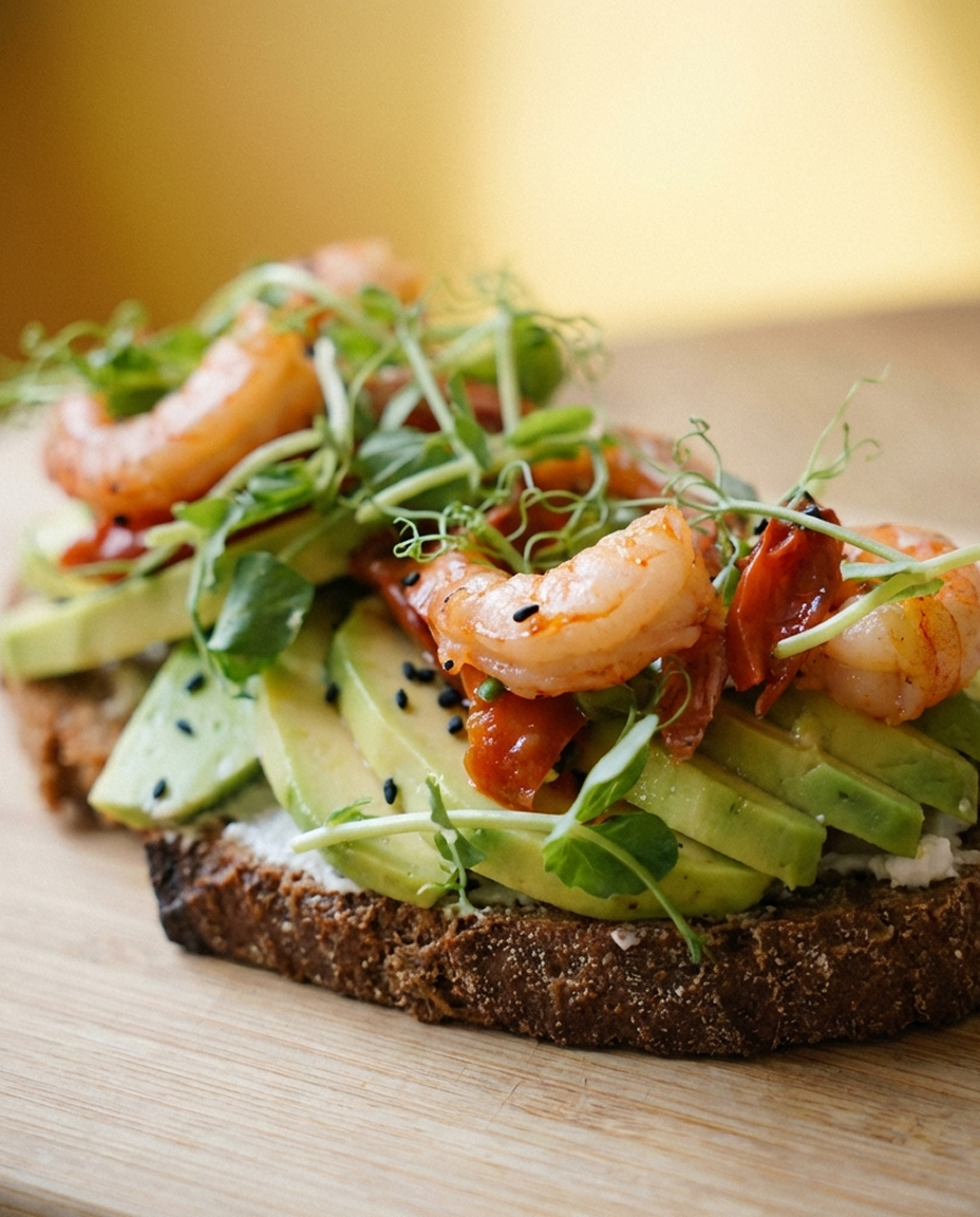 Ржаной хлеб, авокадо, вяленые томаты, творожный сыр, тигровые креветки